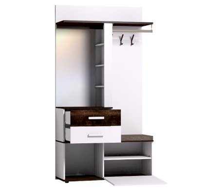 Многофункциональный шкаф Норвуд 70 - находка для маленькой прихожей. В небольшом по габаритам модуле (шириной 1120 мм и глубиной 400 мм) сочетается всё необходимое для обеспечения функциональности прихожей: крючки, стационарная штанга, открытые полки, выдвижные ящики, отделение за откидным фасадом, открытая ниша, зеркало с подсветкой. Встроенная светодиодная подсветка включается при помощи аккуратного кнопочного выключателя. Откидной фасад дополнительно фиксируется при закрывании магнитной защелкой. Горизонтальные детали толщиной 22 мм и фасад верхнего ящика из теплого темного ЛДСП в декоре Орех Шоколадный играют на контрасте с белым декором модуля. В комплектацию входит мягкое сидение, которое позволяет обуваться с комфортом. Регулируемые опоры помогают компенсировать неровности пола в прихожей. Собрать Шкаф МЦН можно как на правую, так и на левую сторону.
