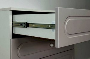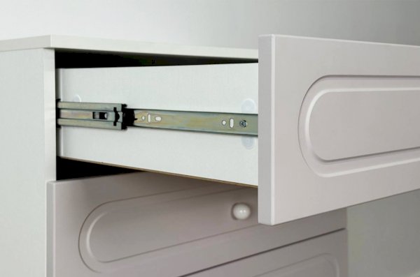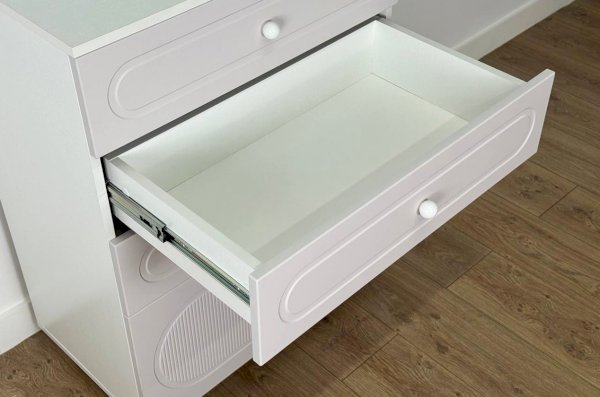 Комод оснащён тремя выкатными ящиками на шариковых направляющих, обеспечивающими плавный и надёжный ход. Ящики подойдут для хранения одежды, белья, аксессуаров или игрушек. В нижней части расположена вместительная откидная секция, предназначенная для более габаритных предметов и сезонных вещей.