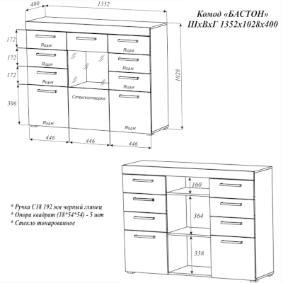 Комод Бастон — практичное и стильное решение для хранения вещей. Выдвижные ящики обеспечивают быстрый доступ к содержимому. Вставка из стекла создает необычный акцент в интерьере и позволяет продемонстрировать ценные книги или предметы декора. Современный дизайн станет частью меблировки комнаты.