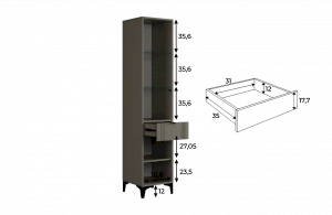 Шкаф оснащён надёжной металлической ручкой и имеет удобное внутреннее наполнение: надёжные полки за стеклянной и глухой дверцами, а также выкатной ящик. Это позволяет рационально использовать пространство.